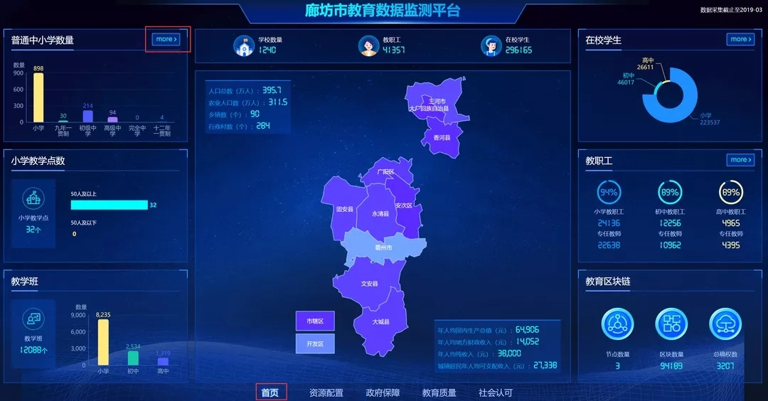 另外,廊坊市教育局教育数据监测平台建设搭建了区校两级应用,建设基于区块链技术的区域教育新生态,实现了各应用系统区级数据采集与分析,结合可信区块链技术,实现了对各种教育动态随时处理,实现了区域可信教育评价与决策。