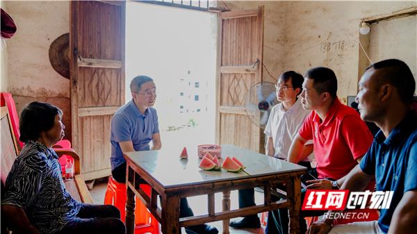 湖南出版投资控股集团党委书记、董事长、中南出版传媒集团股份有限公司董事长彭玻(左二)走进结对帮扶对象家中,仔细询问脱贫致富中的实际困难。