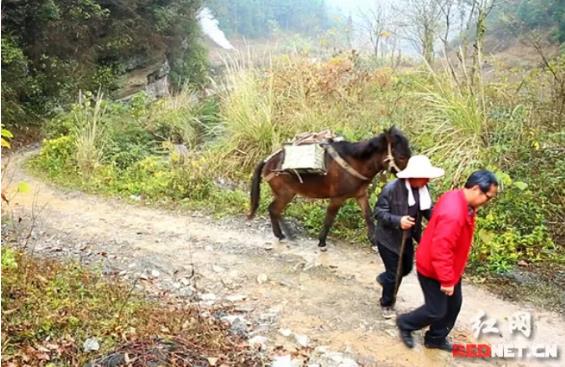 常德石门县新华书店用骡马驮书,为壶瓶山镇后山村农家书屋配送图书。