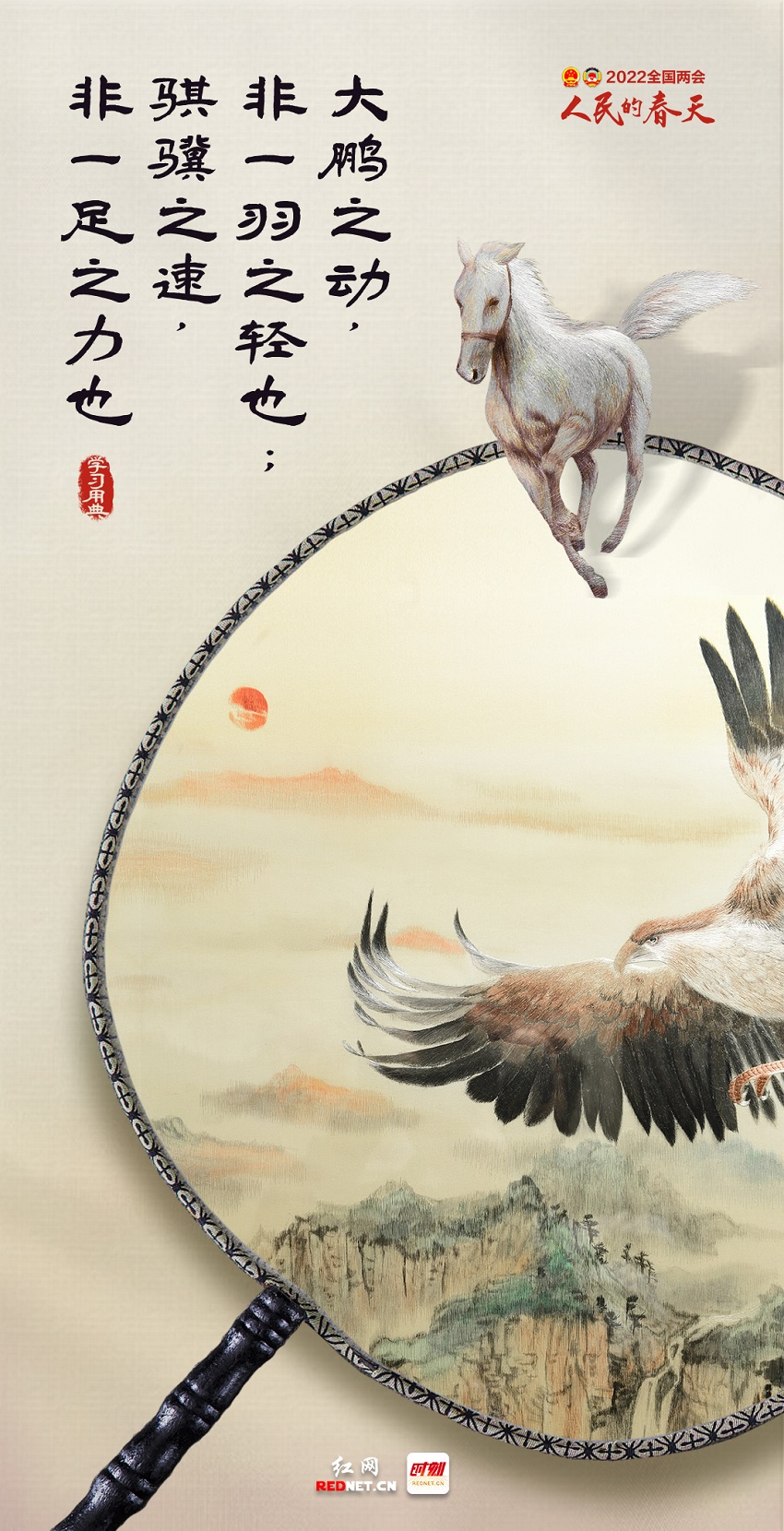 2019年3月4日,习近平参加全国政协十三届二次会议的文化艺术界、社会科学界联组会。习近平强调,“大鹏之动,非一羽之轻也;骐骥之速,非一足之力也”。中国要飞得高、跑得快,就要汇集和激发近14亿人民的磅礴力量。